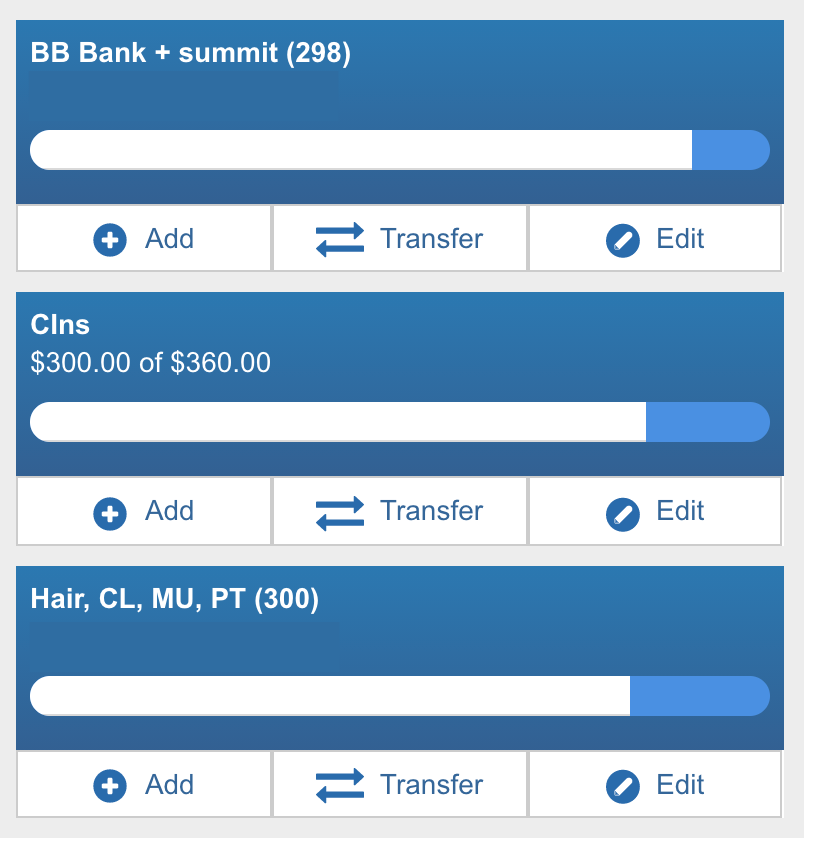 The virtual wallet account comes with three accounts: regular checking “spend” account, regular savings “growth” account, and an in-between “reserve” account for over draft or mid-term savings goals. The “reserve” account is super helpful because I’m able to transfer money to/from the mini accounts: car insurance, side hustle accounts, and the “other” make up, hair, PT, clothes account.